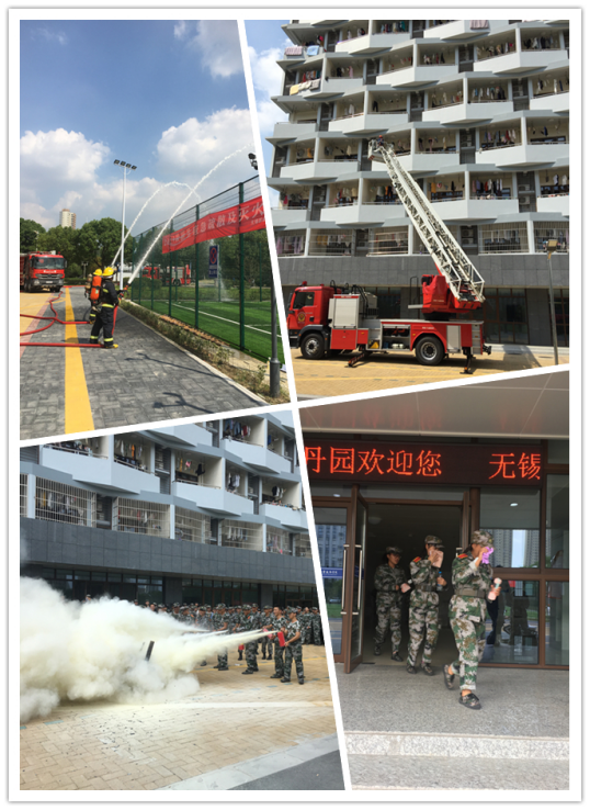 13点35分,强校长下达了演习开始的命令。当火警警报响起后,同学们在老师和军训教官的指挥引导下弯着腰,用湿毛巾捂住口鼻,沿着应急疏散通道快速撤离到安全地带。因火势蔓延,有效疏散通道被火势阻断,部分学生被困四楼宿舍阳台,此时,无锡市消防救援支队的应急救援车已经到达该建筑物消防登高面,消防队员升起云梯顺利把被困学生从阳台上解救下楼。在完成疏散与救援演练后,根据演练计划,军训教官分班分批向新生们演示并组织了灭火演练,让同学们亲身体验,实际掌握灭火技能。