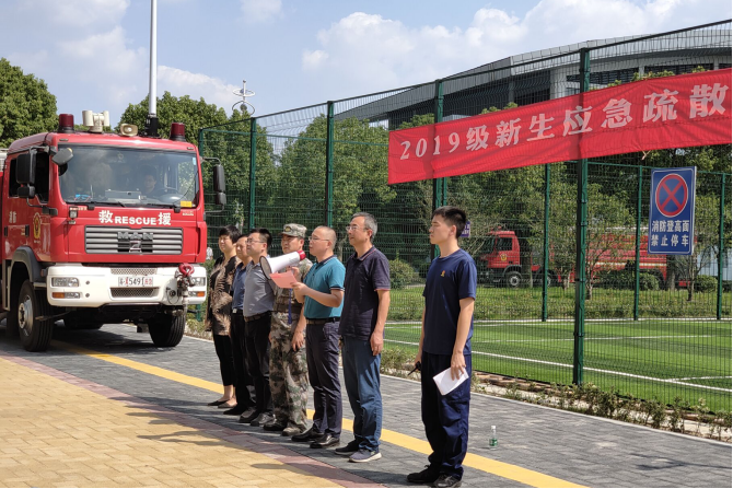 9月17日下午,2019级新生应急疏散及消防灭火演练在学生公寓区举行。副校长强伟纲挂帅指挥,校保卫处与无锡市消防救援支队特勤一中队指战员、2019级新生军训教官联合组织,学生处、后勤处、各二级学院新生辅导员、驻校保安项目部配合参与了此次演练。