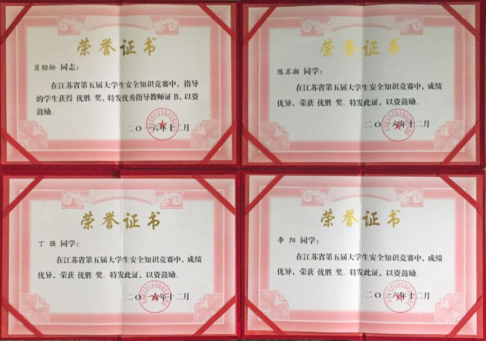 日前,江苏省第五届大学生安全知识竞赛决赛落下帷幕。经过近两个月的网上答题、学校选拔赛、片区复赛、全省决赛几个环节,最终,我校荣获江苏省第五届大学生安全知识竞赛优秀组织奖,保卫处肖劲松老师获优秀指导教师,机械学院数控11631班李阳、物联网学院应用电子31631丁强、管理学院营销41682陈苏湘三位同学获优胜奖。
