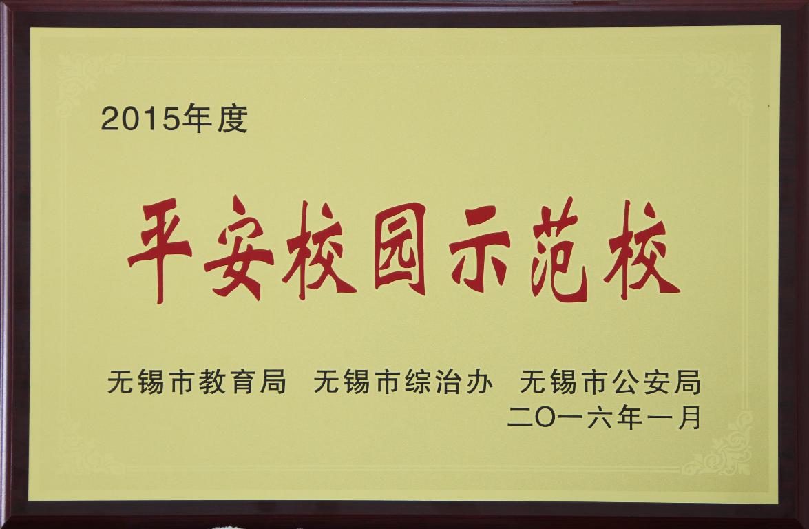近日,在由无锡市教育局、无锡市综治办、无锡市公安局联合举办“创建平安校园示范校”活动中,我校荣获2015年“无锡市平安校园示范校”荣誉称号。