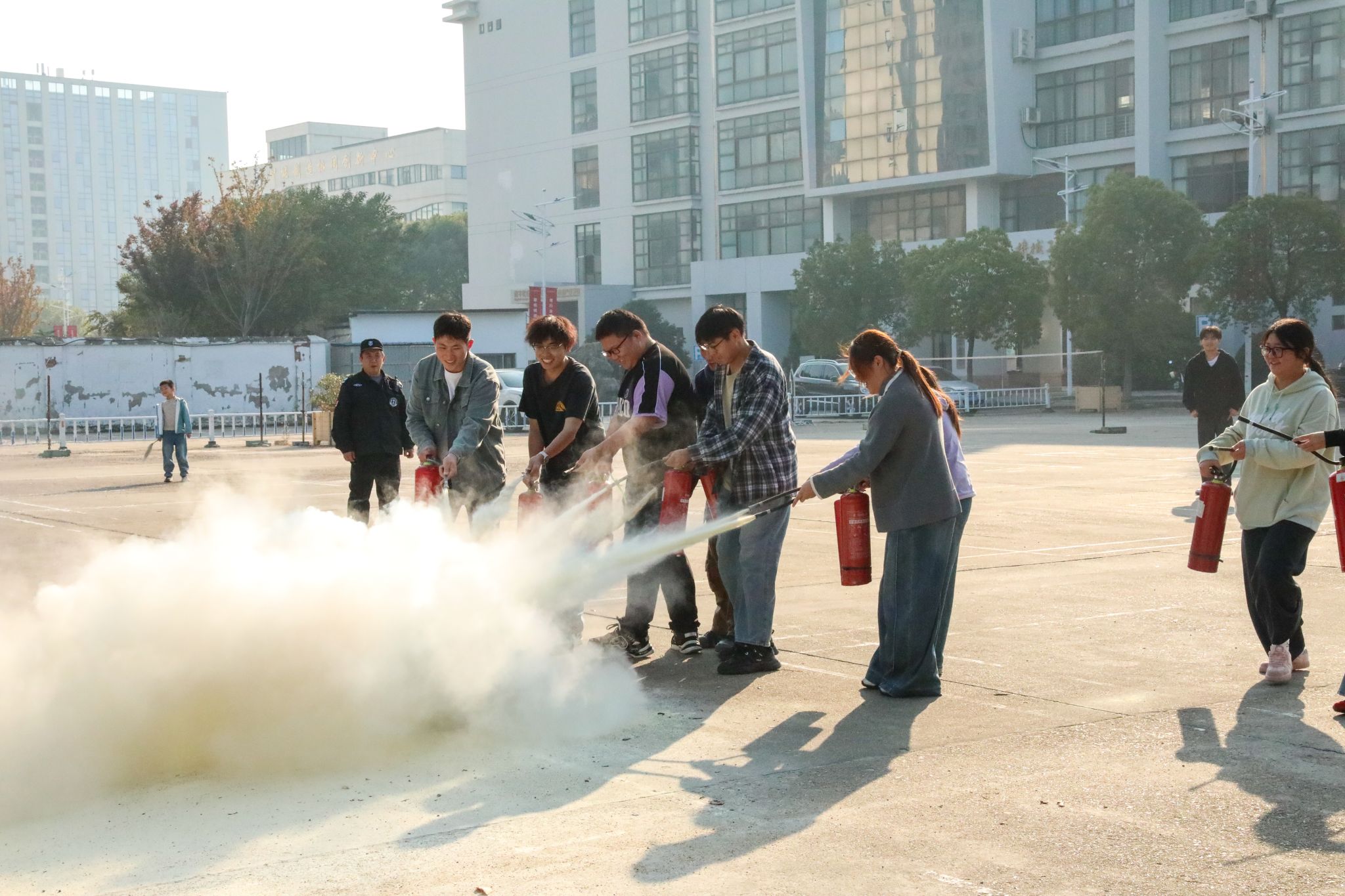 针对后勤外服人员,保卫处联合后勤管理处组织专项演练,结合宿舍管理实际,重点培训应急疏散流程、隐患识别方法与初期火灾扑救原则,强化“小火快灭、大火快逃”的应急处置意识。参训人员依次完成灭火器使用、消防水带连接等实操项目,动作规范、配合默契,展现出良好的应急响应能力。