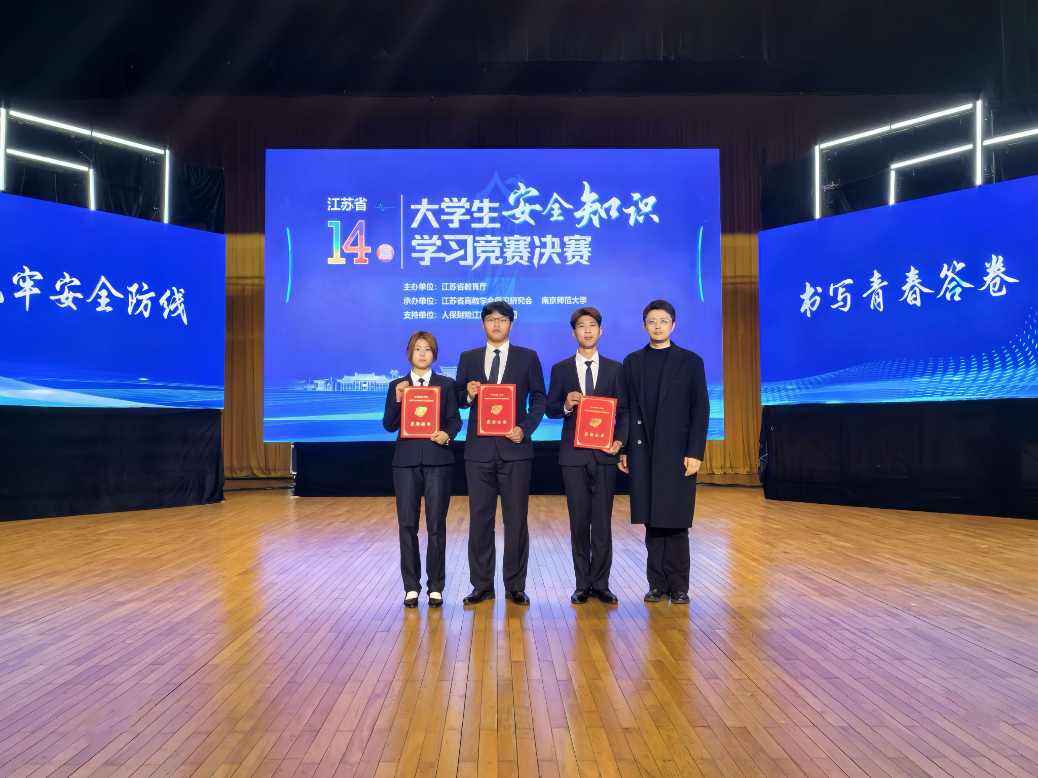 我校选派管理学院郑瑞琪、控制学院刘子洋、物联网学院闫家祺三位同学组队参赛。比赛中,队员们沉着冷静、操作规范,凭借扎实的训练功底与出色的临场发挥,最终以三项满分的优异成绩在本科组脱颖而出获“最佳技能实践奖”。12月28日,我校代表队受邀参加江苏省第十四届大学生安全知识学习竞赛决赛现场观摩并领奖。