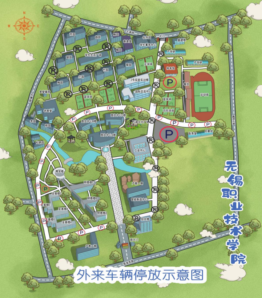2、外来车辆停放。停放区域:校内停车场和北环路、西环路、南环路路面单侧。禁停区域:学生宿舍区、北门主干道、东环路。(详见外来车辆停放图)