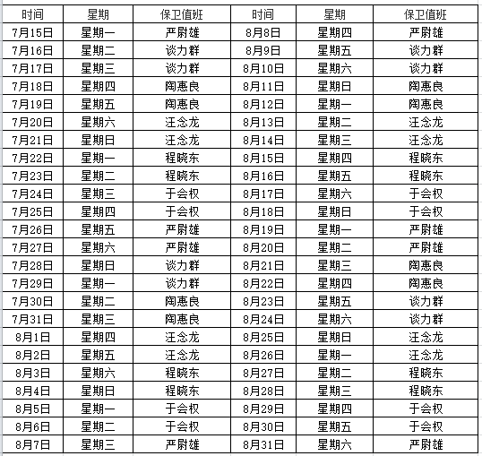 1、保卫处实施全天24小时值班制度,值班安排如下表所示。