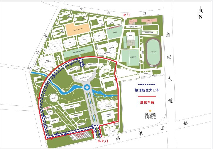 一、校园北门所有通道调整为只面向新生报到的测温审核通道。驾乘网约车、私家车、公交车等方式来校报到的学生统一从北门测温审核通道进校。护送家长及其驾(乘)的机动车一律不得进入校园,学生在北门外大通路临时下客点下车,车辆即停即走。