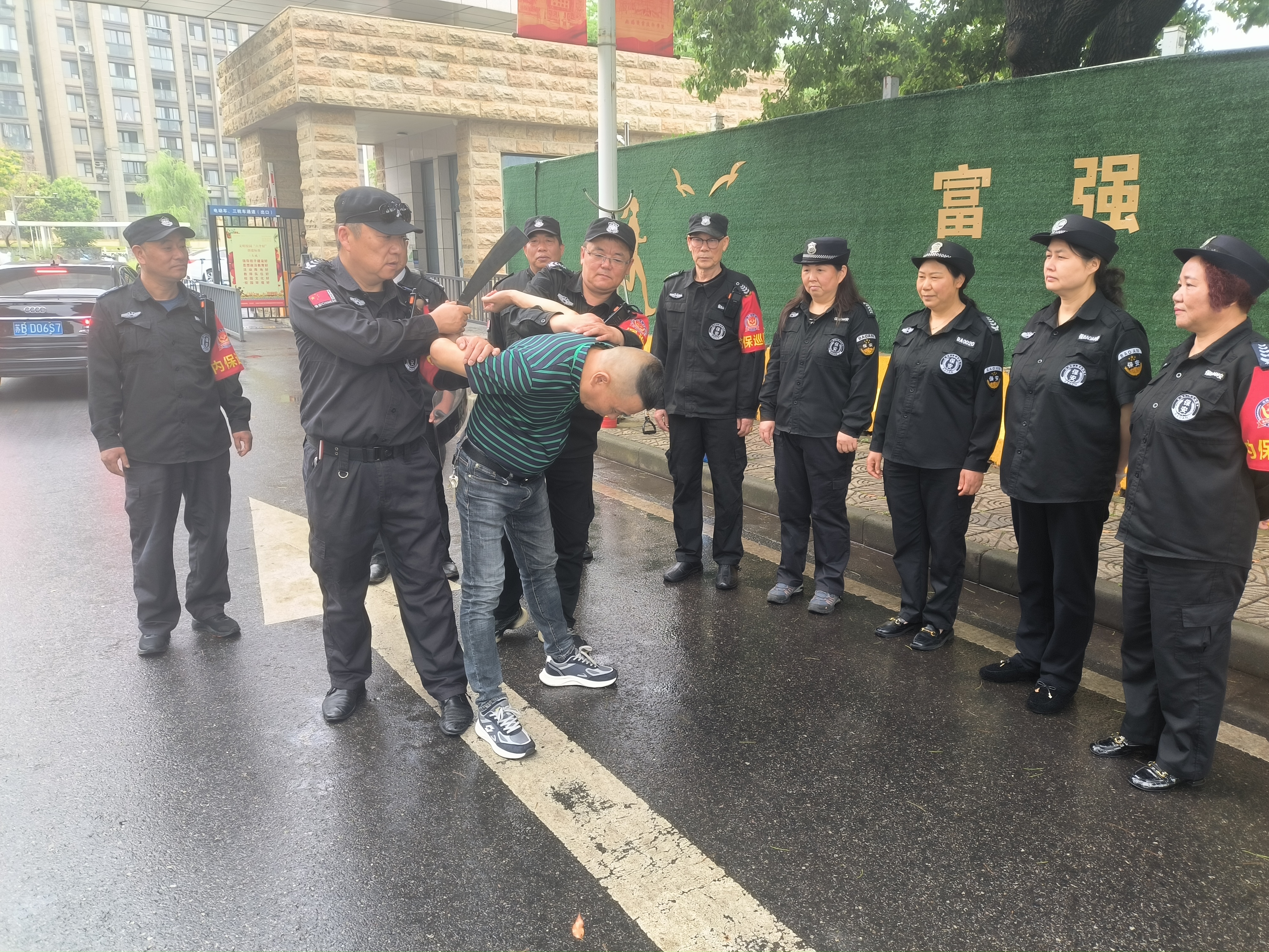 演练过程中,康伟峰警官着重强调了校园安全的重要性,详细讲解了紧急情况下的应急处置措施分工、动作要领,以及各类自卫武器、报警监控装置的操作使用技巧。他特别指出,防卫器材在不同情境下具有不同的用途,并现场指导保安人员进行实际操作示范。为确保演练活动取得实效,本次演练精心设计了模拟“歹徒”闯入校园的紧急情境。一旦“歹徒”闯入,两名训练有素的保安人员立即启动应急响应机制,第一时间向上级和辖区警方汇报情况。同时,手持棍棒、钢叉等防卫器械,以迅雷不及掩耳之势追击并包围了“歹徒”。