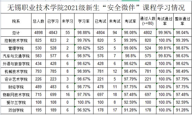 各二级学院: 截止11月18日系统后台的学习情况汇总,该课程的学习仍未达到省教育厅要求的全覆盖,全校4898名新生,目前已登陆学习4843名学生,仍有55名学生没有参加学习,已考试通过4802名学生,未考试94名学生,现将学习与考试情况予以公布,敬请各二级学院根据统计情况有针对性地继续做好组织和督促学习工作,重点督促未参加学习与考试及考试不合格的学生尽快完成学习及考试任务。本学习平台计划于2021年11月30日关闭。